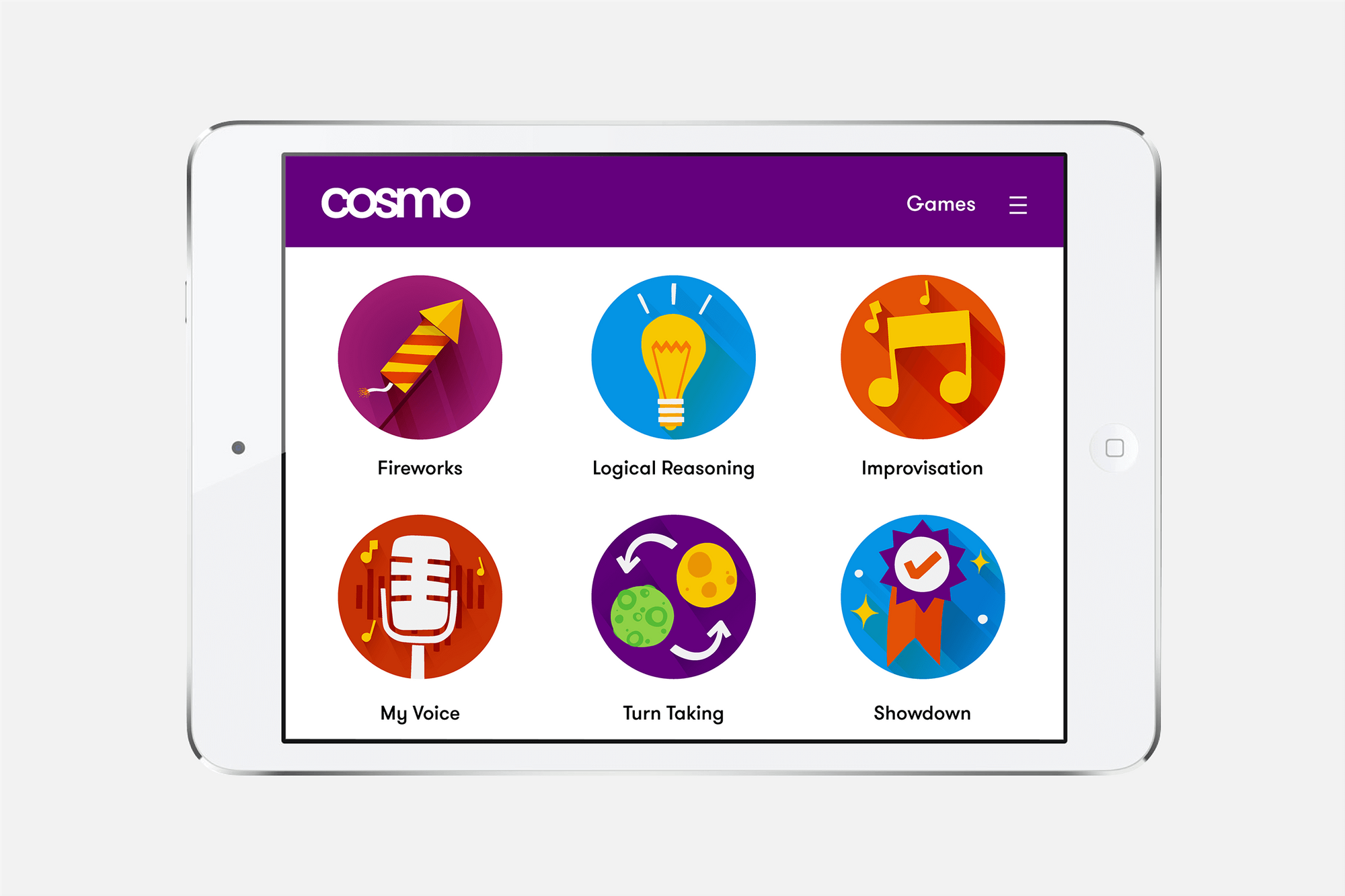 Cosmo comprises of modular, dynamic, hardware controllers and a software platform with interactive software exercises. The exercises help train cognitive, communication and motor skills through games and musical expression. Therapists and educators can select among various interactions that support the development of: Joint Attention, Turn Taking, Choice Making, Collaboration, Motor Skills, Language, Waiting, Transitions, Storytelling, Executive Function, Sensory Awareness.